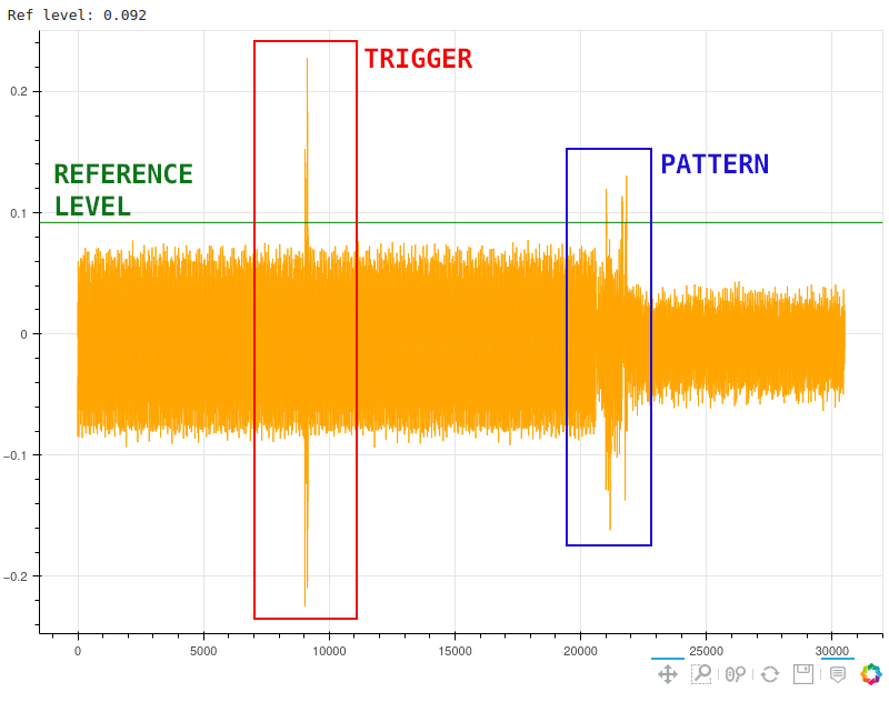 Pattern as seen by the embedded measurement of the ChipWhisperer and identified reference level.