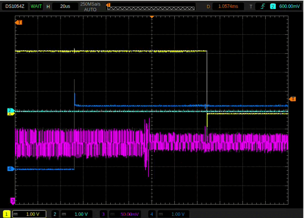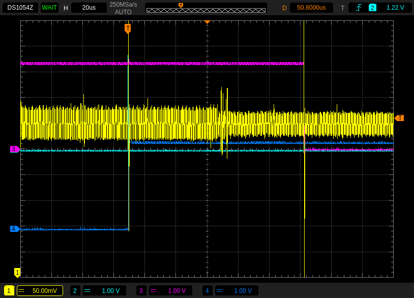 Believing (a little) in luck, and as we needed to halt this study for some weeks, we decided to inject glitches in this very wide window using a Raspberry Pi that controlled the ChipWhisperer Husky. After several days we did get one successful fault that confirmed the RH850 password protection could be bypassed. However, relying on luck is not what we aimed for. Wanting to see if we could have a reliable setup to perform such an attack, we worked on finding a better trigger than the one used.