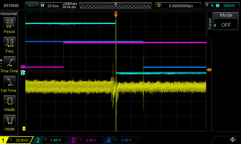 After a few attempts, we did notice a ~4µs long pattern that sounded interesting. Comparing various traces on our oscilloscope confirmed the shape of the pattern.
