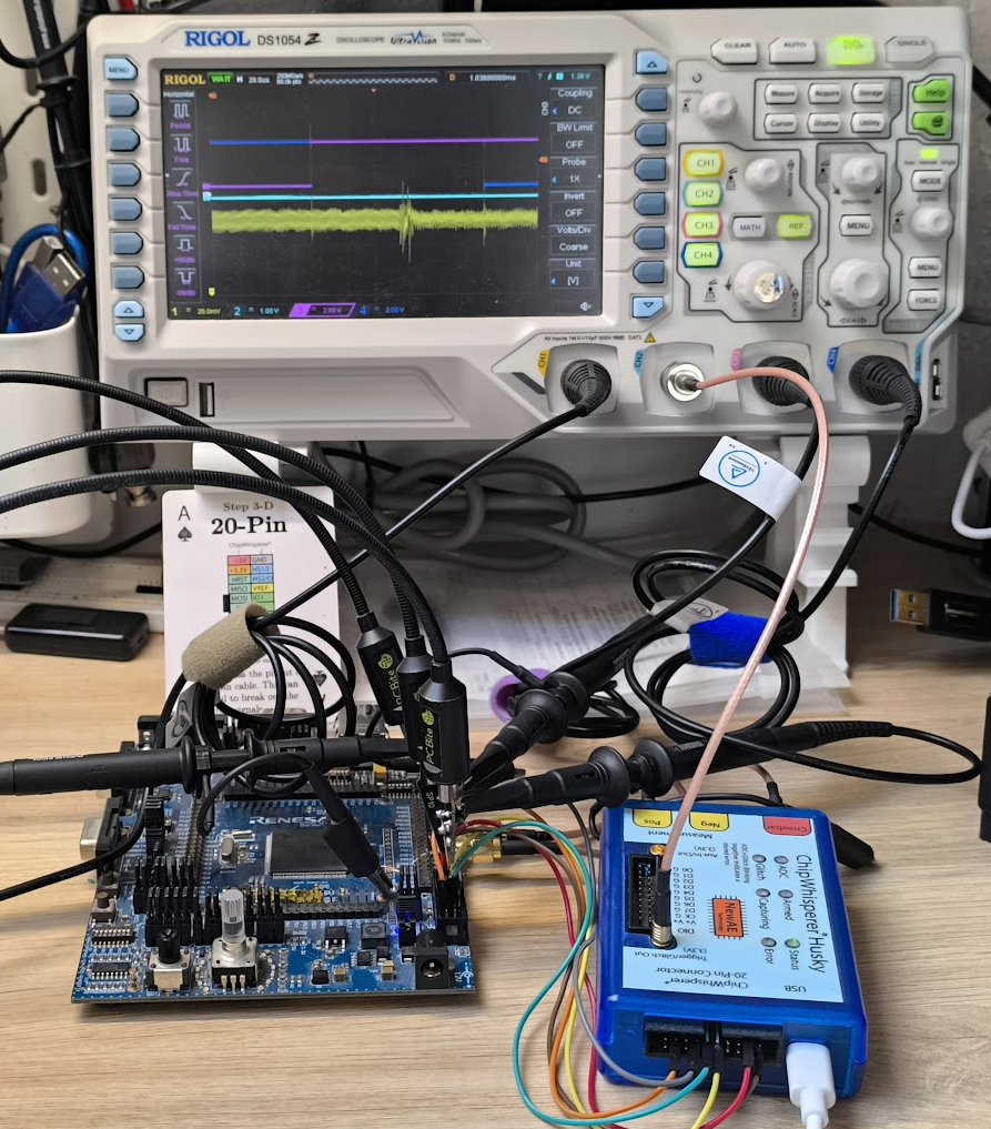 Setup with the RH850 development board, the ChipWhisperer Husky and a Rigol oscilloscope.