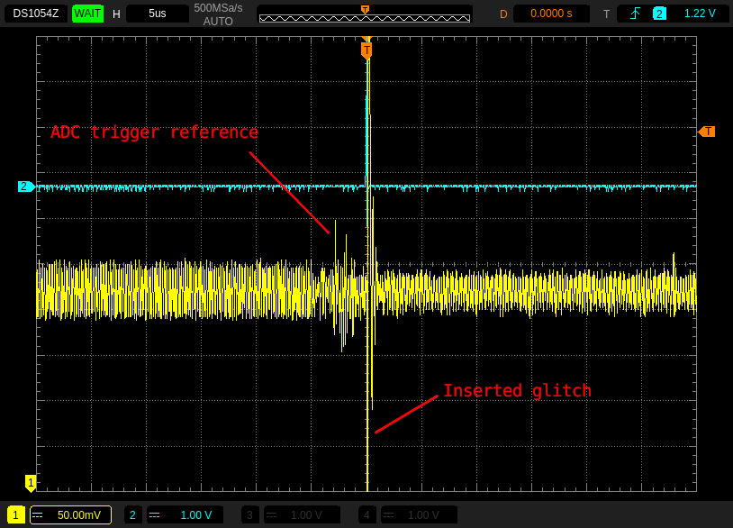 Visualisation of the successful glitch on the oscilloscope.