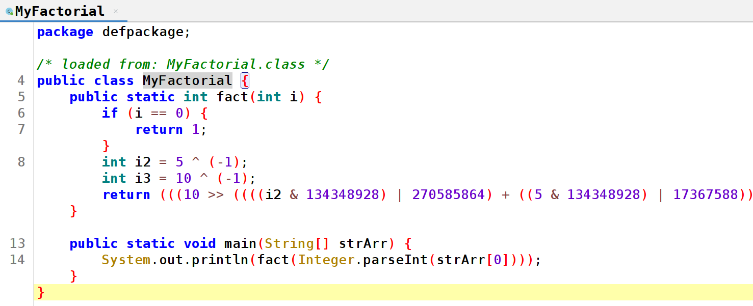 12:54:22.445 [main] DEBUG MethodObfuscator - Introducing a fake conditional jump to factorial code