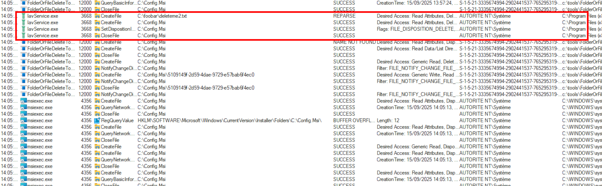 Procmon capture confirms the delete action as SYSTEM.
